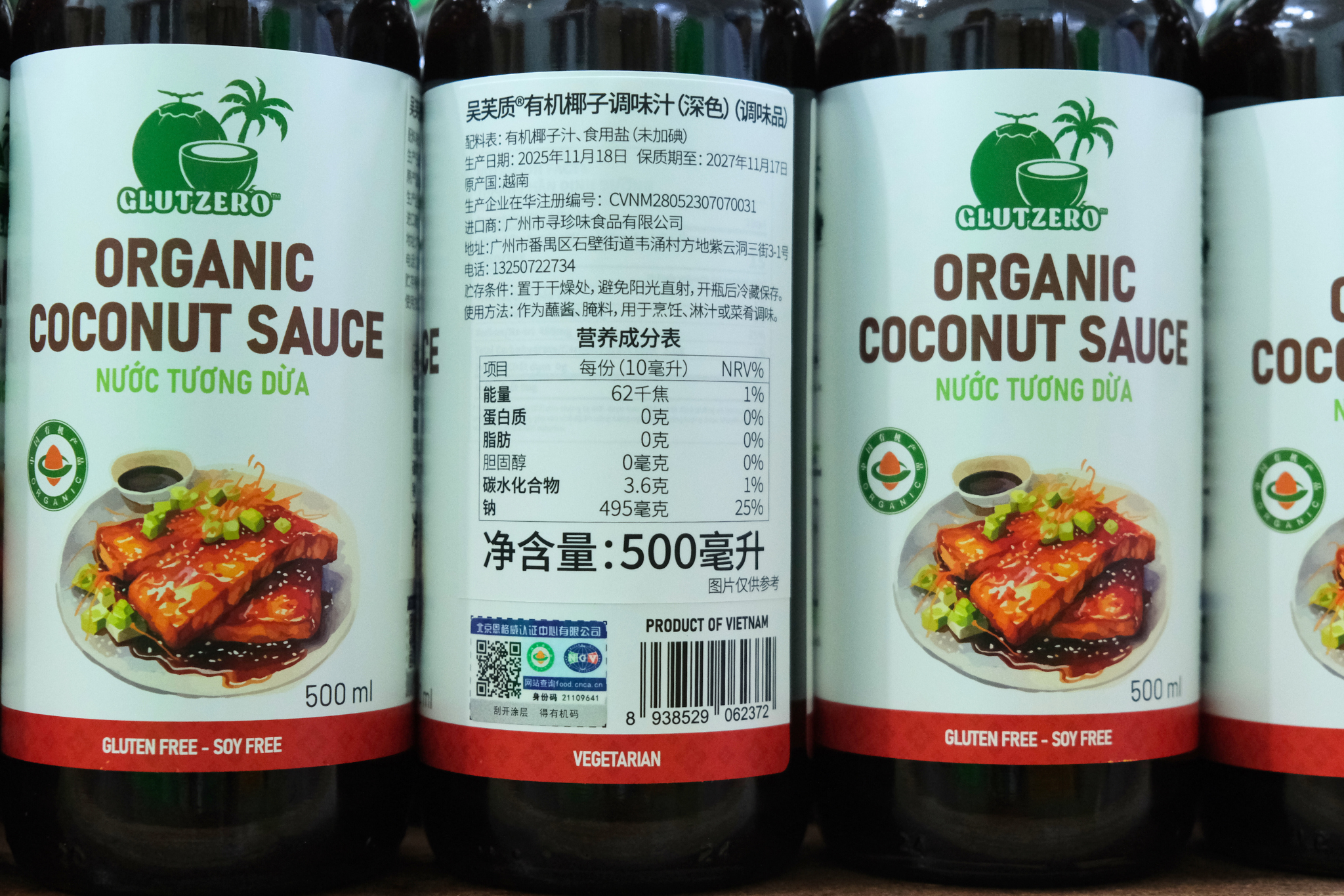 Mỗi chai nước tương xuất khẩu đều có logo China Organic Mark – dấu nhận diện bắt buộc đối với hàng hóa hữu cơ nhập khẩu, thể hiện sự tuân thủ các yêu cầu về quy trình sản xuất và nguyên liệu.